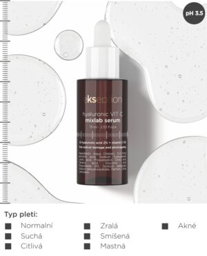 Aktivní sérum na podporu kolagenu, ochranu před volnými radikály a foto-stárnutím se 2% nezesítěné XS kyseliny hyaluronové a 5% ET-vitaminu C (Et-Vitamin C je multifunkční derivát vitaminu C s vynikajícím bělícím a antioxidačním účinkem. Zachycuje volné radikály a podporuje růst kolagenu. Jeho stabilita je lepší než u jiných derivátů kyseliny askorbové. Vykazuje silný inhibiční účinek na melanogenezi a tím snižuje tvorbu a zesvětluje tmavé a stařecké skvrny. Proti foto-stárnutí bojuje se zánětlivými cytokiny a reverzní produkcí ROS. Je výborný lapač volných radikálů.